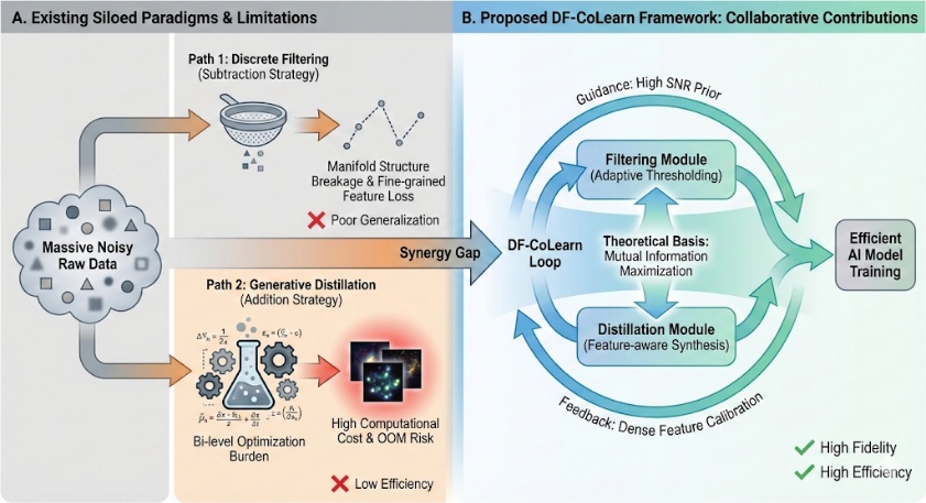 In order to solve the endogenous contradiction between the data scale dividend and the diminishing marginal effect of computing power in large-scale deep learning, this paper proposes a collaborative learning framework for large-scale Dataset distillation and Filtering (DF-CoLearn). By constructing a dynamic feedback closed loop based on bi-level optimization and mutual information maximization, the Pareto optimality between training efficiency and model generalization ability is realized, which provides a new theoretical perspective and technical path for green and efficient AI model training.