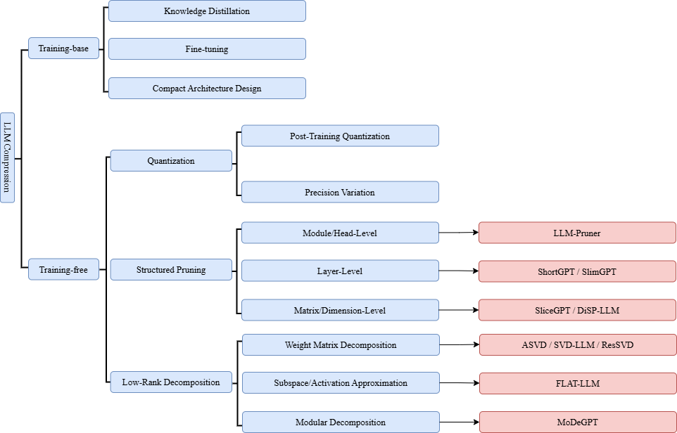 The well-known Large Language Model (LLM) compression is essential for enhancing computational efficiency, yet a systematic summary of investigation into structured pruning and low-rank decomposition remains absent in current literature. This work addresses the gap by providing a comprehensive review specifically focused on these two methodologies. Representative approaches are categorized and evaluated, including LLM-Pruner and SlimGPT for structured pruning, and ASVD and SVD-LLM for decomposition. These methods are rigorously analyzed in terms of algorithmic design, accuracy retention, and hardware adaptability. Through unified evaluation and comparative analysis, DISP-LLM and MoDeGPT are identified as the current state-of-the-art within their respective fields. Consequently, a conceptual framework is established to provide practical guidance for future research into efficient, training-free, and scalable LLM compression.